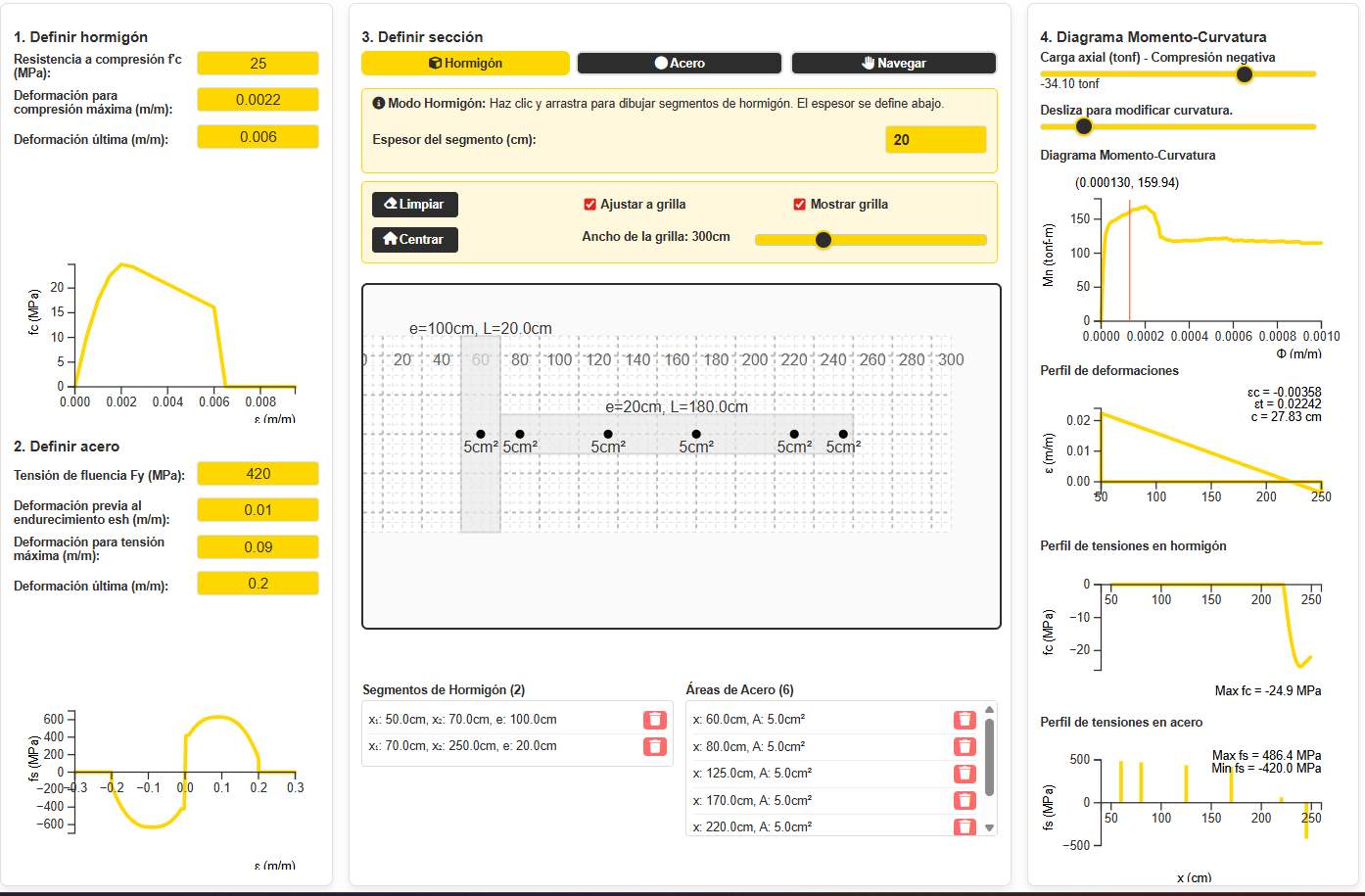 El Mini Section Designer es una aplicación que se accede a través del navegador y permite evaluar una sección de hormigón armado simple. Se define la geometría de la sección, se insertan sus armaduras como áreas de acero concentradas, y luego se visualiza su diagrama de momento-curvatura y de interacción.